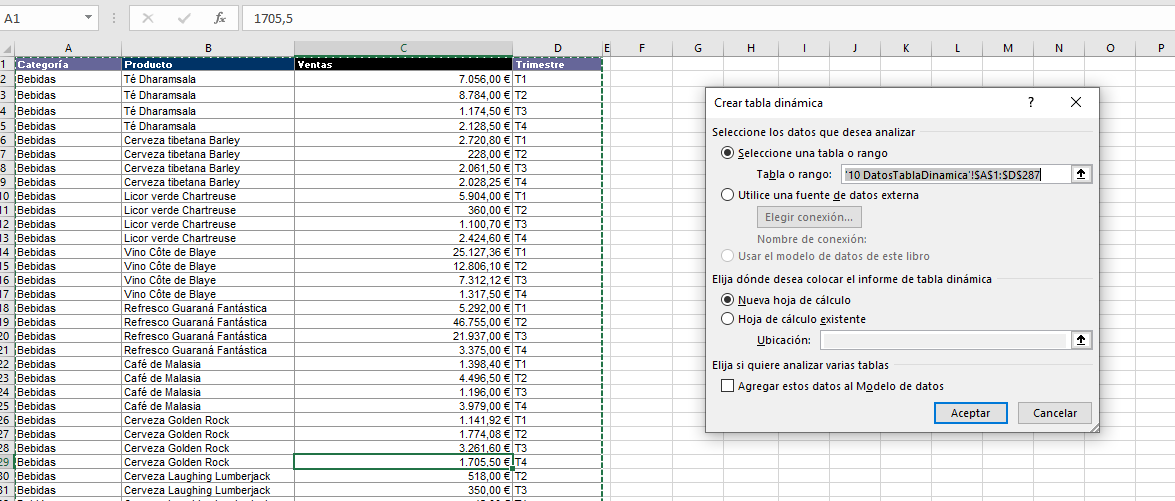 En este ejemplo tenemos una lista con 4 columnas y 287 filas con datos de productos y las ventas que se han producido en cada trimestre. Ahora realizaremos diferentes informes dado que la columna de categoria tiene diferentes datos que se pueden agrupar, al igual que los productos y los trimestres.