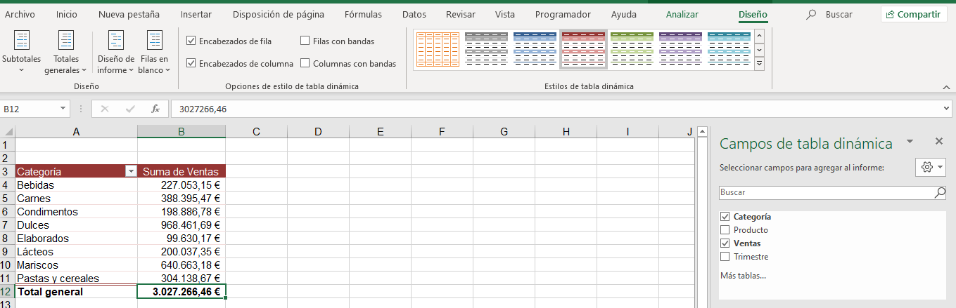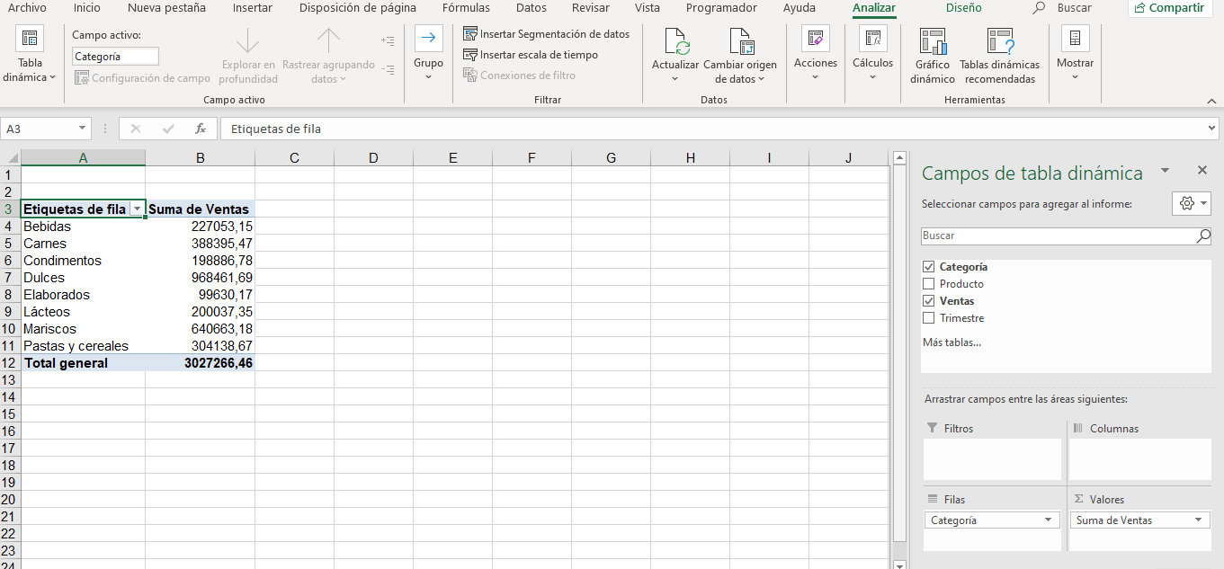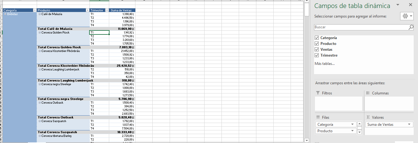 En este otro informe se ha añadido el trimestre. Ahora muestra la suma del valor de cada producto agrupado por categoría y trimestre.