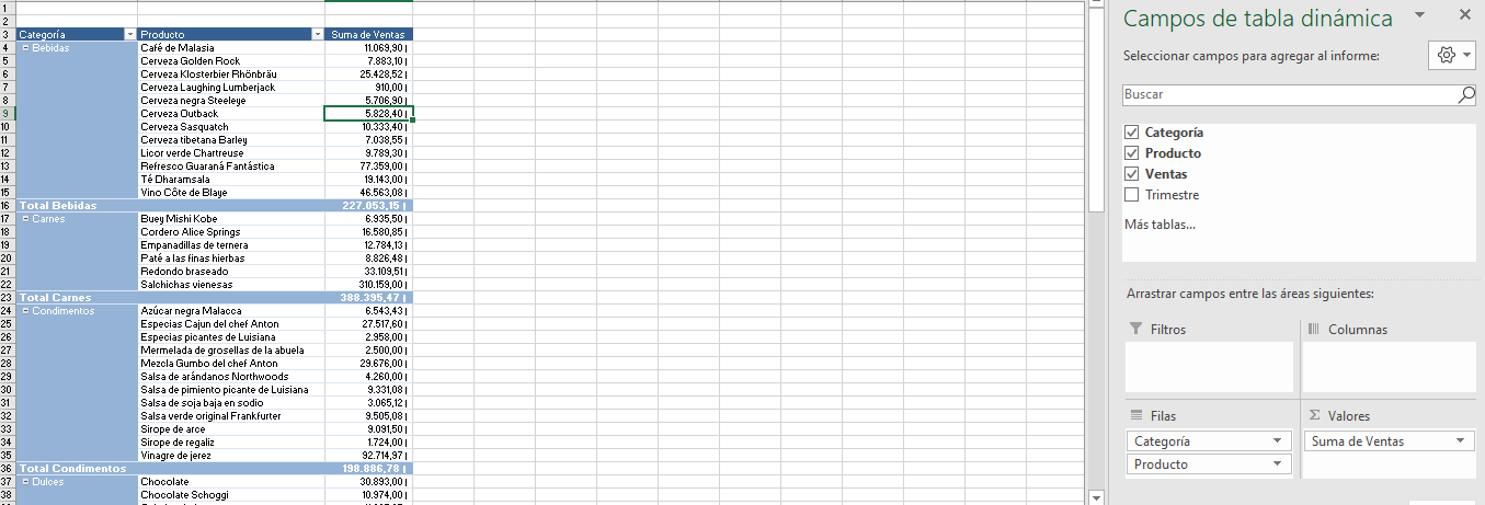En el siguiente informe se ha añadido tan sólo la columna de producto. Ahora muestra la suma del valor de cada producto agrupado por categoría.
